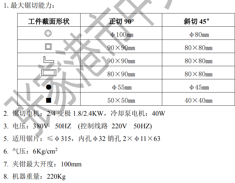 2 鋸切電機:2 4 變極 1 8 2 4KW,冷卻泵電機:40W3 電壓:380V 50HZ (控制線路 220V 50HZ)5 適用鋸片:≤φ315,內(nèi)孔&ph