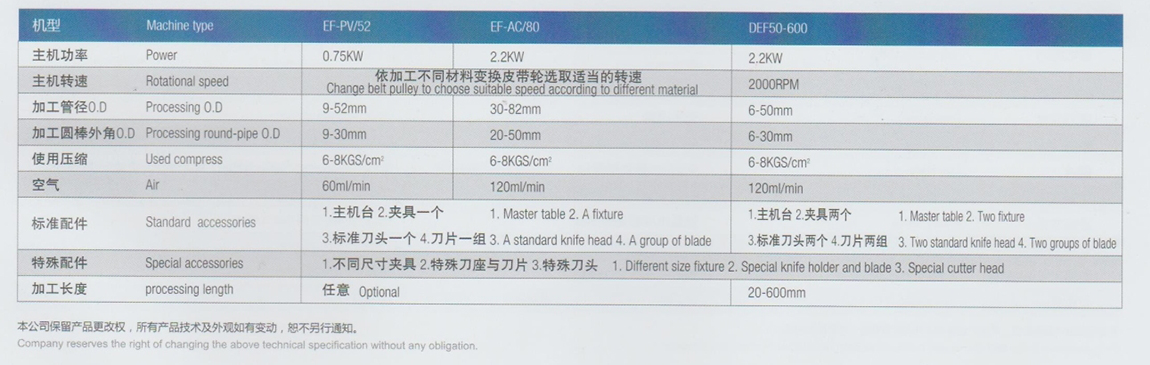 機械特點: 1 夾模與刀盤經(jīng)過精巧的設(shè)計,確保加工物件與刀盤的中心線準確不變??梢砸淮尉鶆虻赝瓿晒芏说耐饨牵瑑?nèi)角及管端的加工。 2 利用皮帶輪的變化可轉(zhuǎn)換多個轉(zhuǎn)速,適應(yīng)各種不同材質(zhì)的金屬材料,取得更長的刀具壽命。 3 兩段進刀速度節(jié)省工時,且慢速易于調(diào)整,加工完美。