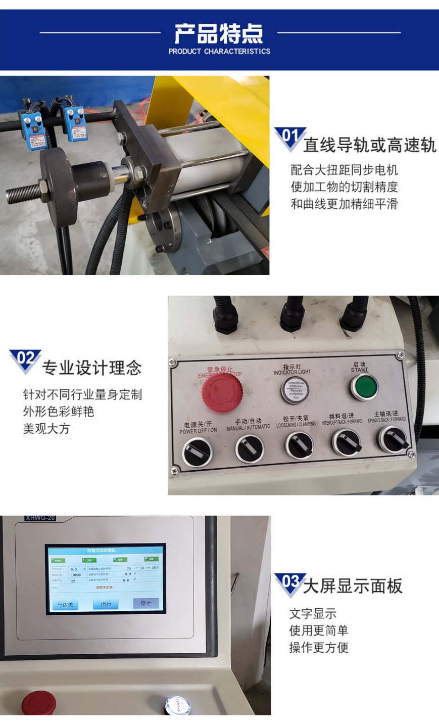 直線導(dǎo)軌或高速軌:配合大扭距同步電機,使加工物的切割精度和曲線更加精細平滑;專業(yè)設(shè)計理念:針對不同行業(yè)量身定制,外形色彩鮮艷,美觀大方;大屏顯示面板:文字顯示,使用更簡單,操作更方便。